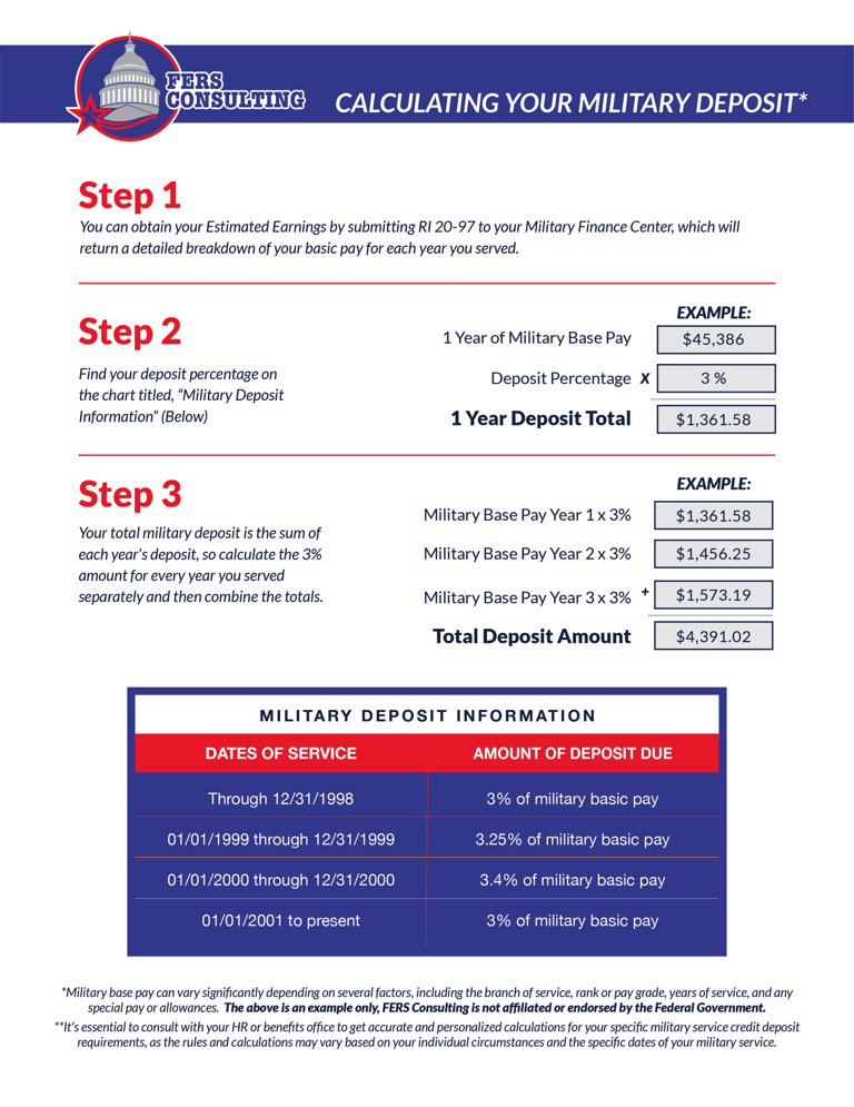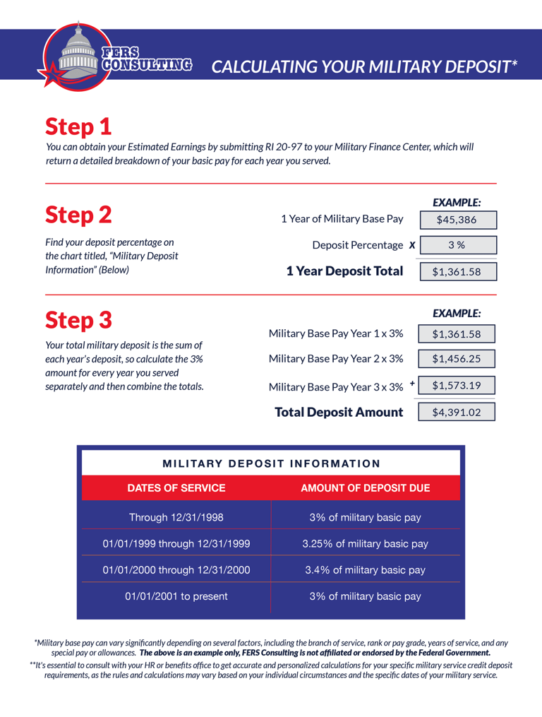 What is the Deposit For?: The deposit represents the contributions you would have made to your FERS retirement account if you had been employed by the federal government during the time you served in the military. This deposit is typically a percentage of your military pay during the time of your service. The specific percentage varies depending on when you performed your military service. (See chart below)